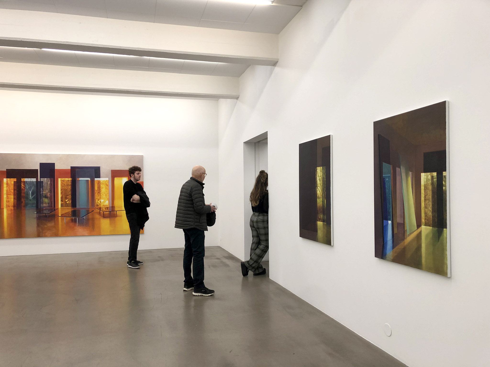 Flensburg’s process, from beginning to finished painting, has its starting point in a prototype made of paper. She builds the prototype and lights it with different-colored sheets of acrylic glass. The prototype is moved between different environments and lights before it is finally photographed. The photos become templates for the motif she then paints. The works, Painting in a drawer and Still life with a jar from the exhibition, are painted on the back of the canvas. A method that causes the oil paint to be further absorbed into the canvas and gives a woollier surface and texture that could resemble woven garments. In the series The Veins and the Space, which are painted on panel, the wood’s veins and shade clearly break through the paint so that the history of the material merges with the quiet poetry of the room. In recent years, nature has entered her paintings and can be seen in the openings of the interiors such as windows or open doors. As a reminder that life is out there but has not yet made its way into the room.