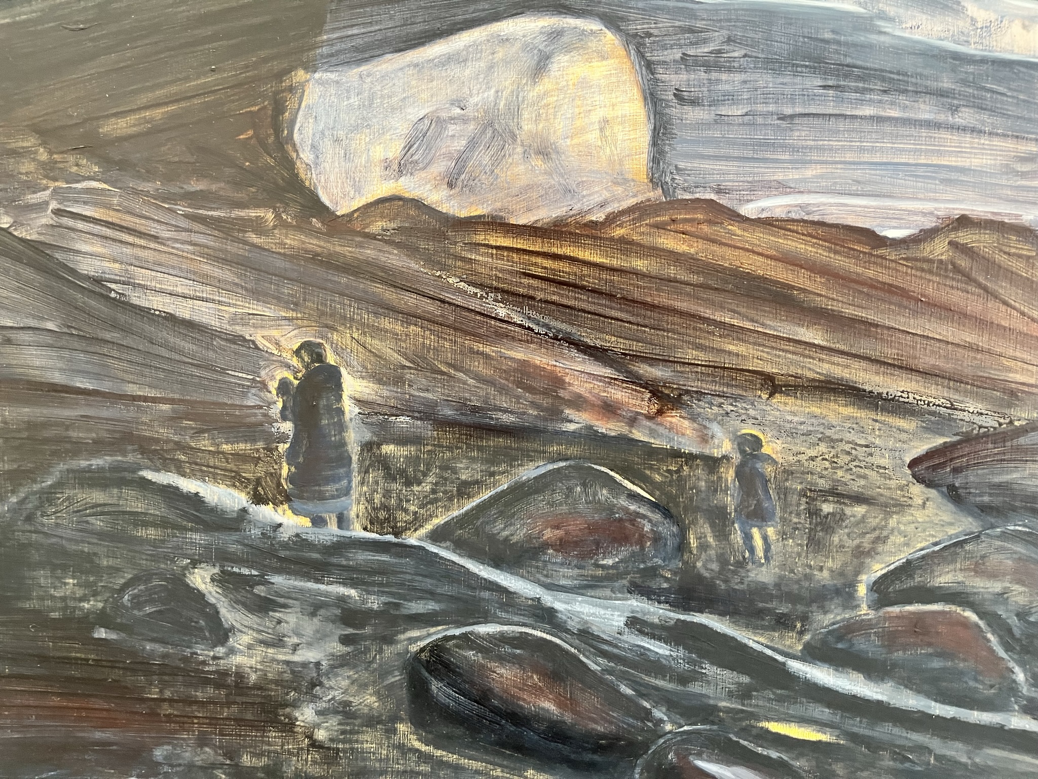Agnes Treherne (b. 1987) lives and works in East Sussex, United Kingdom. Treherne’s paintings are based on observations of daily life and the landscape surrounding her, like stills from a film with an enduring gleam. Time has stopped and imprinted the desolate figures in a refined and eternal light. The composition of the works appears to be planned thoroughly as well as spontaneously. The colours are meticulously balanced but also genuine. The characters seem overwhelmed by the landscape and weighed down by existence, but here there is also a lightness and a barren beauty that can give hope and reassurance.